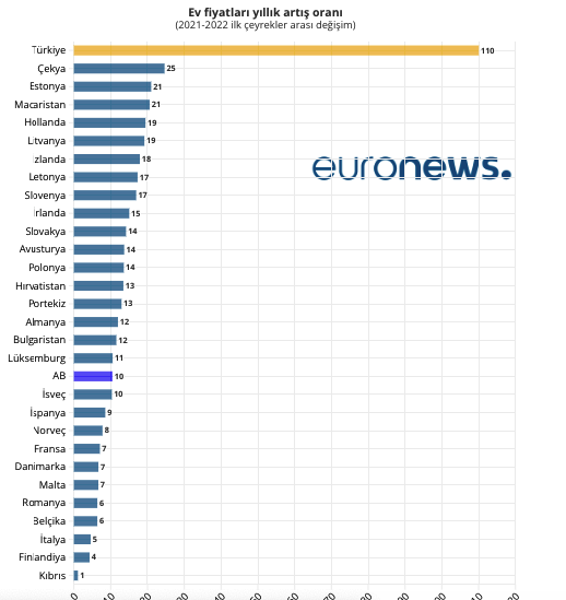 AB İstatistik Ofisi (Eurostat) 2021 ile 2022 ilk çeyrekleri arasında satılık ve kiralık konut fiyatlarının yıllık ne kadar yükseldiğini açıkladı. 2022’nin ilk çeyreğinde geçtiğimiz senenin aynı dönemine göre Türkiye’de ev fiyatları yüzde 110 yükselirken, 27 AB ülkesinin ortalaması ise yüzde 10,5 oldu.