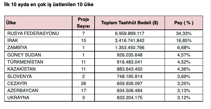 Yurtdışında aldıkları işleri yüksek standartlarda ve belirlenen süreler içinde bitirerek tüm dünyada öne çıkan Türk müteahhitler, başarılarına yenilerini ekliyor. Yıllık 20 milyar dolarlık yeni proje hedefini bu yılın ilk 10 ayı itibariyle yakalayan müteahhitlerimiz, üstlendikleri 196 yeni projeyle 20,3 milyar dolarlık iş hacmine ulaştı. Bu projelerde 103 milyon doları aşan ortalama proje bedeli de tüm zamanların en yüksek rakamı oldu. Ortalama proje bedeli en son 2015 yılında 83 milyon dolara kadar yükselmiş, ardından geçen süreçte yarıya kadar düşmüştü. Ticaret Bakanlığı’nın verilerine göre, Türk müteahhitler, böylece 1972’den 2021 Ekim ayı sonuna kadar toplam 130 ülkede 442,2 milyar dolar değerinde 10.890 proje üstlendi.